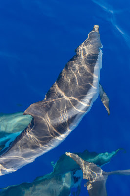 A few hours later, as the temperature rises under the scorching sun and the motoring starts becoming really annoying, I emit the hypothesis of a swim. The water is of such inviting deep blue, the sun is so hot, the water is perfectly still. As I am about to jump in, Kim points at a big floating thing no more than a couple hundred meters from the boat. She reaches for the binoculars but concludes that it’s probably a piece of garbage. I jump on the roof of the boat and have a second look. If it is a piece of garbage, why are there fins frenetically moving around it?